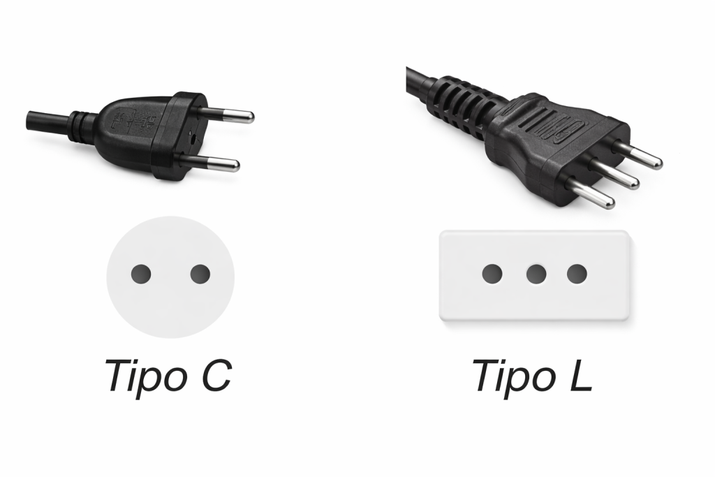 Enchufe tipo L: Tiene tres patas redondas. Se utiliza para dispositivos de mayor potencia.